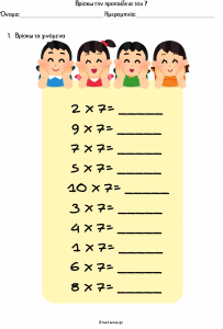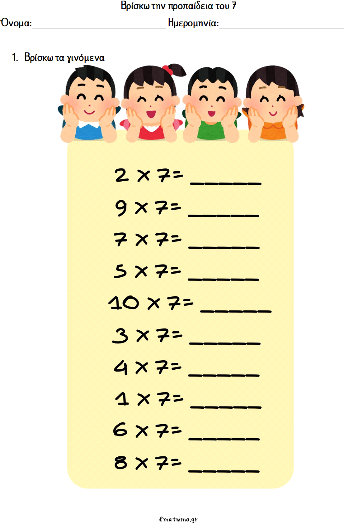Πατήστε τους παρακάτω συνδέσμους για να κατεβάσετε στον υπολογιστή σας και να εκτυπώσετε φύλλα εργασίας με την προπαίδεια του 7 . Κατάλληλα για τις μικρές τάξεις του δημοτικού και για παιδιά με μαθησιακές δυσκολίες.