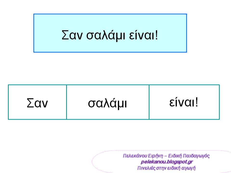 • Πραγματοποιείται άσκηση φωνολογικής επίγνωσης με τις λέξεις καμάκι, καμάρι, καλαμάρι, καλαμάκι, σαλάμι, καλάμι.